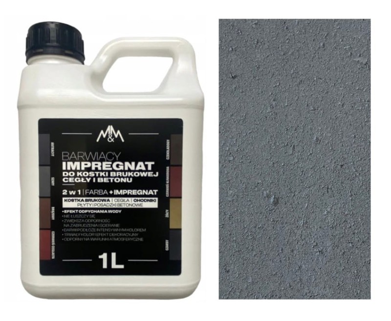 Przedmiotem sprzedaży jest wysokiej jakości Impregnat barwiący do kostki brukowej, cegły, betonu M&M 1l kolor szary