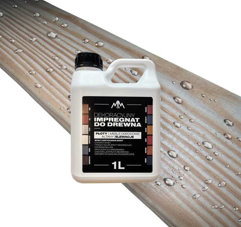 Impregnat M&M przeznaczony jest do dekoracyjnego zabezpieczania drewna i elementów drewnopochodnych przed niszczącym działaniem wody oraz zmiennych warunków atmosferycznych. Impregnat zawiera woski, które odpychają wodę od powierzchni. Barwniki zawarte w produkcie są odporne na promienie UV co gwarantuje trwały kolor. Chroni drewno przed pleśnią i wykwitami. Impregnat można stosować wewnątrz i na zewnątrz. Można stosować na malowane wcześniej powierzchnie. Produkt przyjazny dla środowiska, nie zawiera rozpuszczalników.