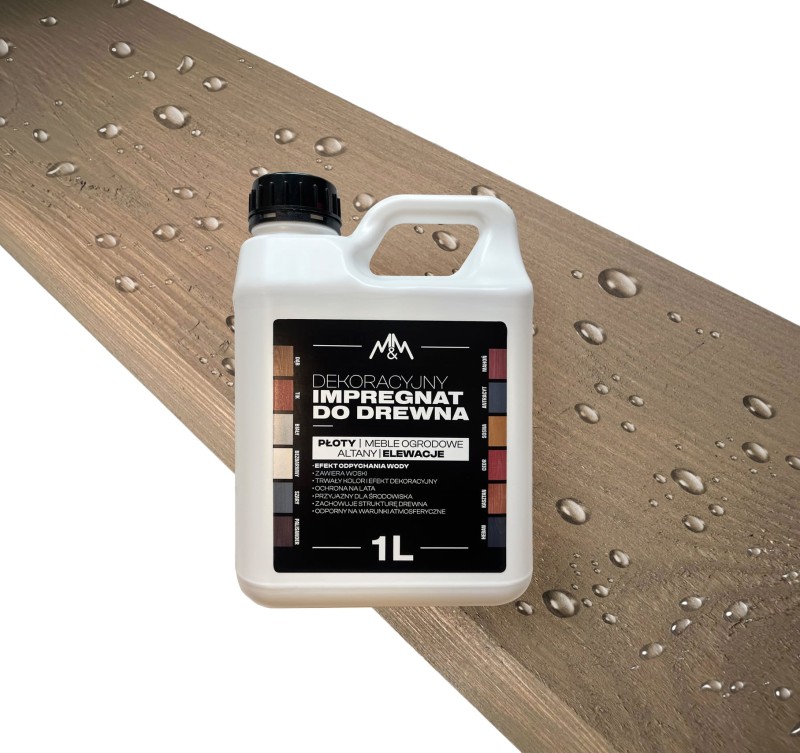 Impregnat M&M przeznaczony jest do dekoracyjnego zabezpieczania drewna i elementów drewnopochodnych przed niszczącym działaniem wody oraz zmiennych warunków atmosferycznych. Impregnat zawiera woski, które odpychają wodę od powierzchni. Barwniki zawarte w produkcie są odporne na promienie UV co gwarantuje trwały kolor. Chroni drewno przed pleśnią i wykwitami. Impregnat można stosować wewnątrz i na zewnątrz. Można stosować na malowane wcześniej powierzchnie. Produkt przyjazny dla środowiska, nie zawiera rozpuszczalników.
